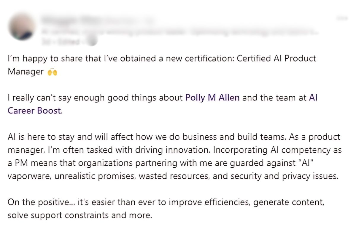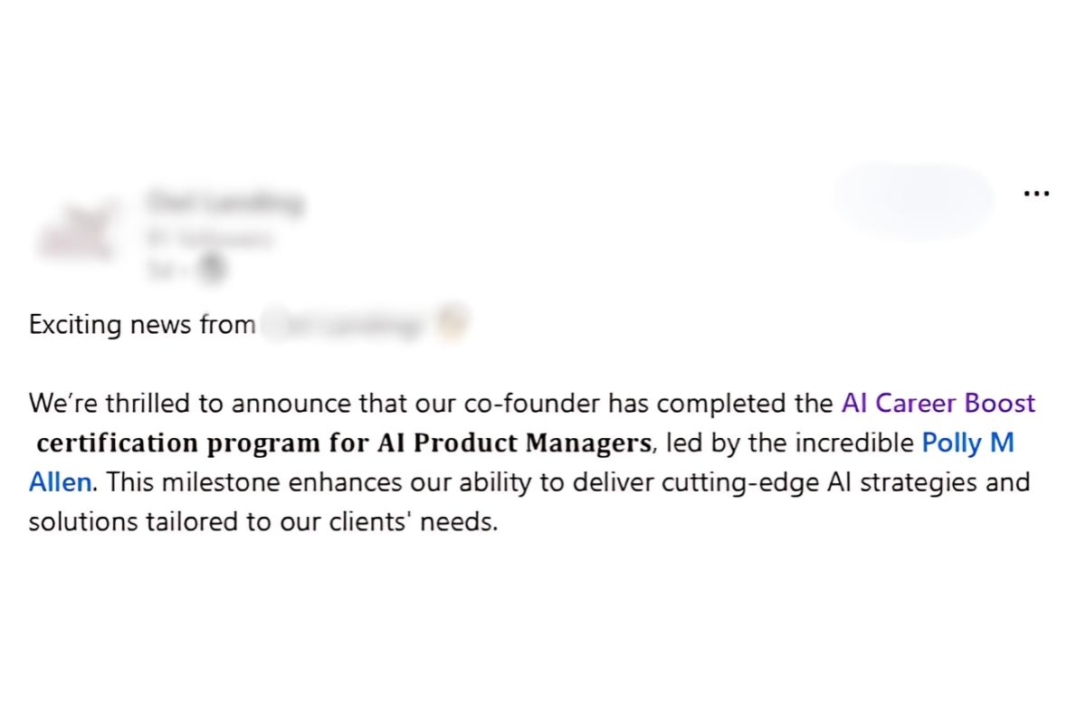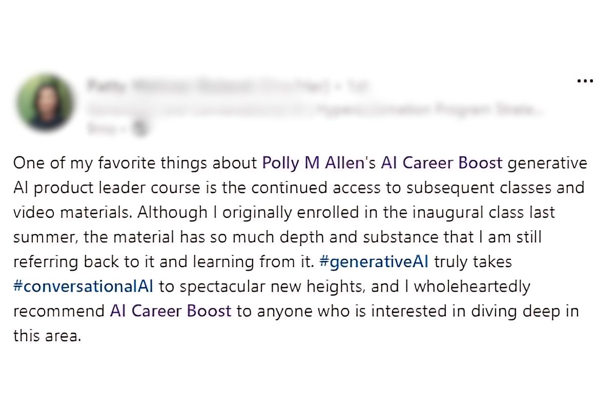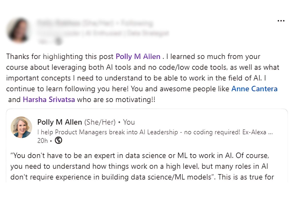 "While I have taken other data science and AI classes before, this summer was the first time I took an AI PM focused course. I actually took two. The one that stood out to me was Polly M Allen's AI Product Leader course.